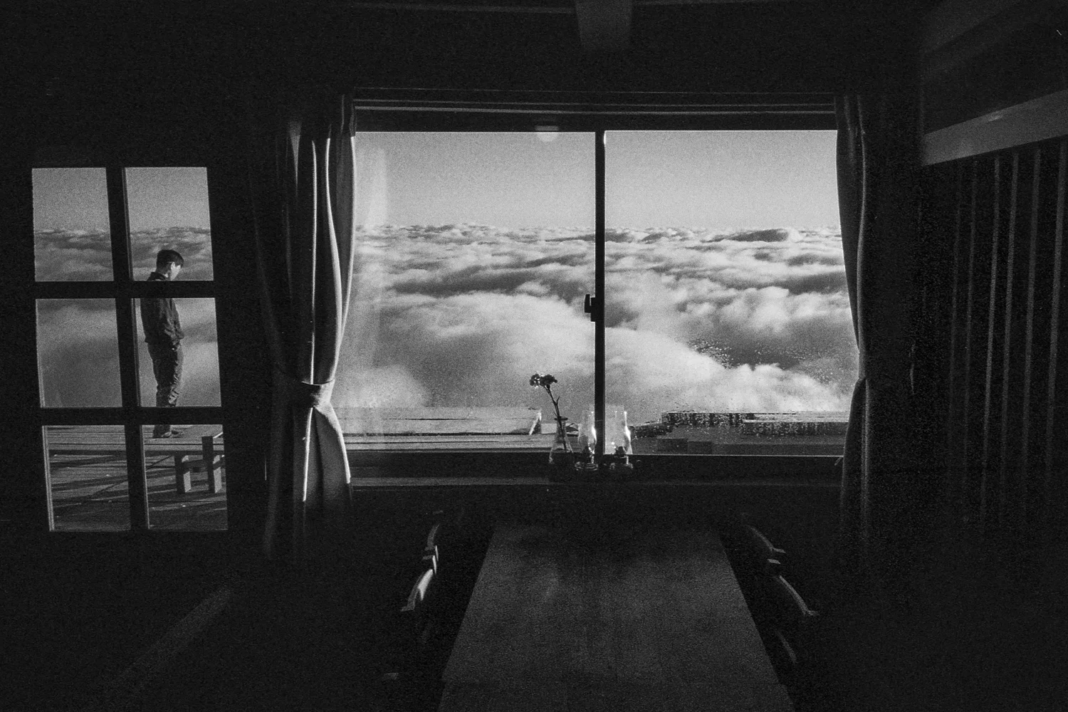 他に登山者はいない。小屋は濃いガスに包まれ、白い霧以外なにも見えなかった。
